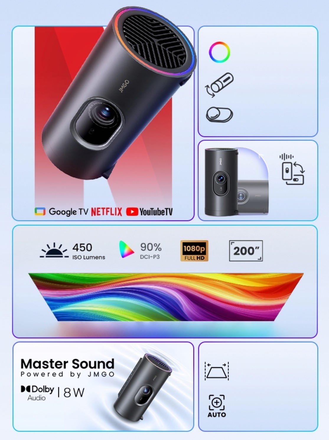 Integrované audio: 8W reproduktor s Dolby Audio môže fungovať v režime Bluetooth, čím projektor premení na štýlový hudobný prehrávač.